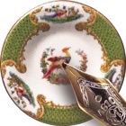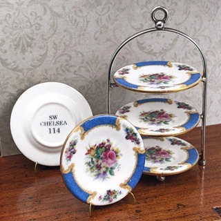 The Stokesay Ware range of Chelsea plates for doll's houses are real plates in miniature. We handmake them ourselves here in London from bone china clay which is fired, then glazed and fired again. The decoration of coloured ceramic enamels and 22ct gold is applied separately and permanently fired on in the kiln. We also draw our own artwork so each part of the process is our own.