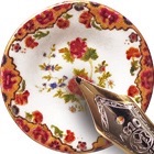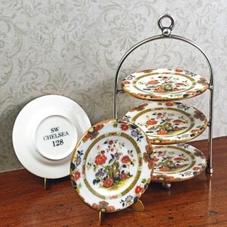 The Stokesay Ware range of Chelsea plates for doll's houses are real plates in miniature. We handmake them ourselves here in London from bone china clay which is fired, then glazed and fired again. The decoration of coloured ceramic enamels and 22ct gold is applied separately and permanently fired on in the kiln. We also draw our own artwork so each part of the process is our own.